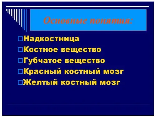 Повторим основные понятия по строению кости: надкостница, костное вещество, губчатое вещество, красный костный мозг, желтый костный мозг.