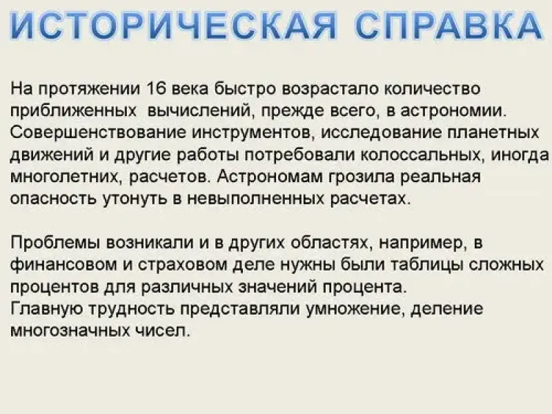 Формулировка и запись определения логарифма, операции логарифмирования, основного логарифмического тождества. Экскурс в историю появления логарифмов.