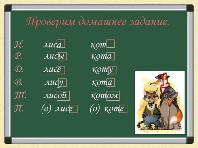 - Сегодня на уроке мы откроем новый секрет имён существительных. (На доске открывается записанная часть темы урока.) - Какой это секрет, вы узнаете позже. Можно ли сказать, что мы "наживём добра" в виде новых знаний? (Слайд № 3.) - В домашнем задании вы просклоняли слова лиса и кот. Что вы можете сказать о падежных окончаниях: одинаковы ли они в одних и тех же падежах? - Поменяйтесь тетради и проверьте друг у друга написание окончаний по образцу на слайде. Если найдёте ошибку у друга, поставьте на полях напротив карандашом галочку. - Как вы думаете, почему падежные окончания слова лиса отличаются от падежных окончаний слова кот? |