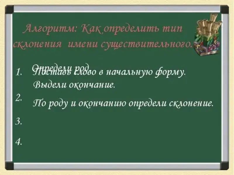 - Это всё замечательно, но мы с вами пропустили один пункт. Какой - вы догадаетесь сами. Обратимся к пословице - девизу нашего урока: "Час в доброте пробудешь - все горести забудешь". Найдите имена существительные, выпишите их столбик и определите склонение. - Почему не можем сразу определить склонение? - Что надо с ними сделать? - Итак, какой пункт мы пропустили? (На экране появляется новый пункт алгоритма.) - Как вы думаете, этот пункт каким номером надо поставить? (На экране появляется последовательность пунктов алгоритма.) - Запишем слова в начальной форме и определим склонение. |