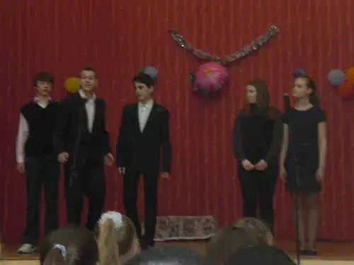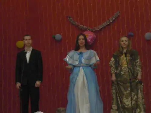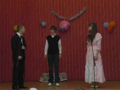 Зал аплодирует. Звучит торжественная музыка. Ученики отходят в стороны.
