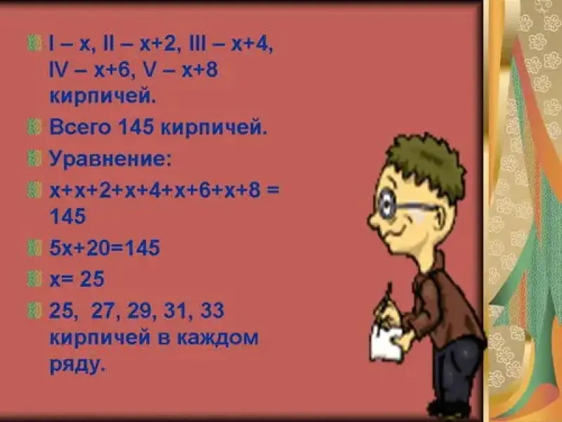 Ученик. Ведь не сказано, сколько кирпичей надо уложить в первом ряду. Обозначим неизвестное число кирпичей в первом ряду за х, тогда во втором - х+2, в третьем - х+4, в четвертом - х+6, в пятом - х+8, вся сумма 145. Решаем уравнение (решают), получаем х=25. Итак, 25, 27, 29, 31, 33 кирпичей в каждом ряду. (слайд 26)