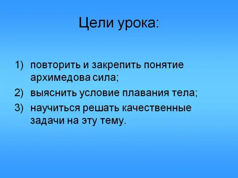 - повторить и закрепить понятие «Архимедова сила»;