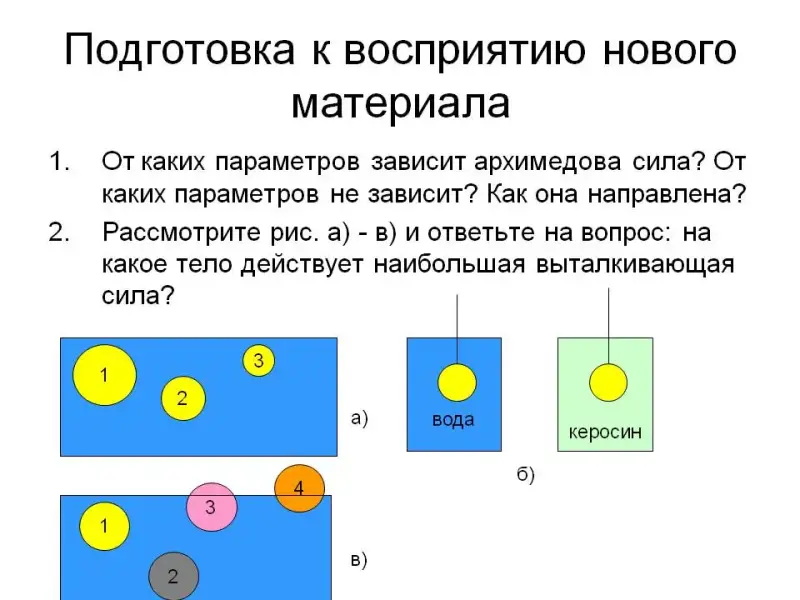 На этапе подготовке учащихся к восприятию нового материала предлагается ответить на четыре вопроса для повторения темы «Архимедова сила». Ученик записывает на доске формулу архимедовой силы, дает ее определение, указывает, куда она направлена. Важно добиться от учеников правильного понимания формулировки архимедовой силы: «На тело, погруженное в жидкость или газ, действует выталкивающая сила, направленная вертикально вверх и равная весу жидкости или газа в объеме погруженной в жидкость части». Архимедова сила не зависит от формы и плотности тела. Вопрос 2а иллюстрирует зависимость архимедовой силы от объема тела, вопрос 2б - от плотности жидкости. Ответы на эти вопросы, как правило, не вызывают затруднений у учащихся, а, отвечая на вопрос 2в, большинство учеников ошибаются, считая, что наибольшая архимедова сила действует на тело № 4, так как его меньшая часть погружена в жидкость. Необходимо еще раз обратить внимание учащихся на формулировку и математическую запись архимедовой силы. Сравнивая объемы погруженных частей тел в жидкость, ученики дают правильный ответ (тела № 1 и 2).