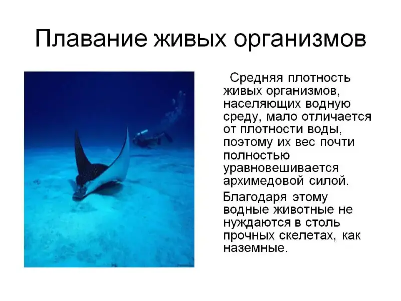 К началу изучения архимедовой силы школьники из курса биологии знают, что водоросли имеют чрезвычайно гибкий стебель, а рыбы - слабый скелет. Слайды №, 12, 13 помогают объяснить эти особенности с точки зрения физики. Средняя плотность живых организмов, населяющих водную среду, мало отличается от плотности воды, поэтому их вес почти полностью уравновешивается архимедовой силой. Благодаря этому водные животные не нуждаются в столь прочных скелетах, как наземные. У рыб есть орган, называемый плавательным пузырем. Меняя объем пузыря, рыбы могут изменять глубину погружения.