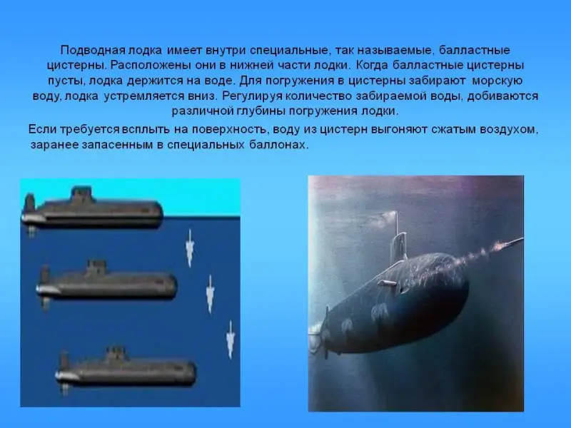 Слайды № 15, 16, 17 помогают ввести понятия: осадка судна; ватерлиния; водоизмещение; грузоподъемность. Слайд № 18 содержит информацию о подводной лодке. В подводной лодке добиваются различной глубины погружения, регулируя количество забираемой воды в специальные цистерны. Здесь можно проследить аналогию с плавательным пузырем рыбы. Данные слайды ученики с удовольствием озвучивают самостоятельно.