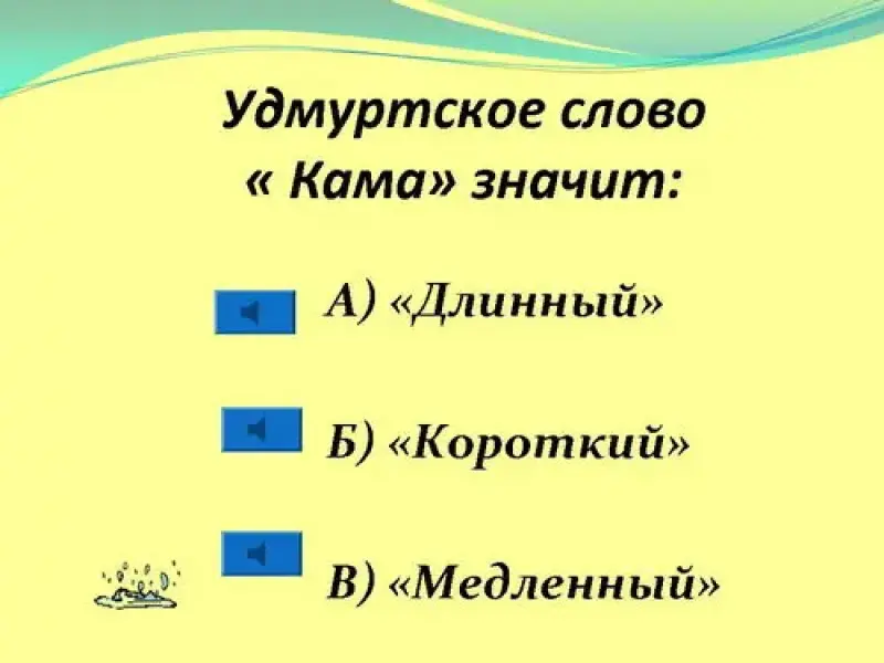 - На следующем уроке мы продолжим знакомство с историей реки Камы. Сегодня на уроке вы многое узнали о Каме. Чтобы подтвердить звание настоящих знатоков родного края, ответим на вопросы теста