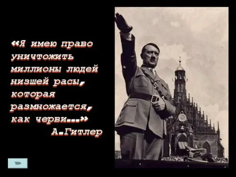Гитлер хотел истребить большую часть русского народа, украинцев, белорусов, а оставшихся превратить в рабов. Он заявлял: "Я имею право уничтожить миллионы людей низшей расы, которая размножается, как черви:". Германия обрушила на Советский Союз всю мощь своей военной машины. Гитлеровцы устремились к советской столице.