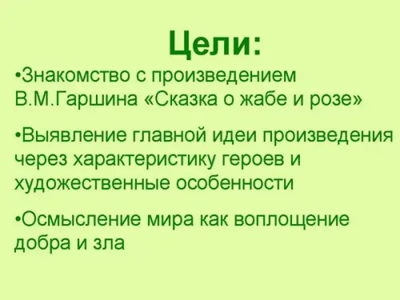 - В.М.Гаршину принадлежит удивительная мысль: "Если ты оставил после себя след красоты души, то будь уверен, что выполнил свою миссию на земле:" Но чтобы почувствовать глубину этой мысли, понять удивительный мир образов художника слова, мы должны быть внимательны, вдумчивы, серьёзны. Сегодня мы продолжаем работу над "Сказкой о жабе и розе", с которой познакомились на прошлом уроке.