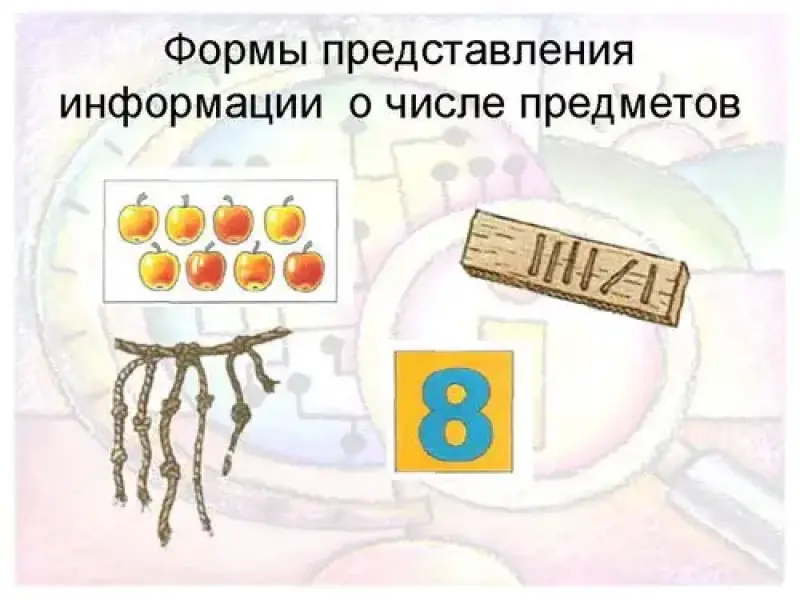 - Зарубки на дереве, иероглифы, узелки на веревочке или записанное современными цифрами число - все это различные формы представления информации о числе предметов.