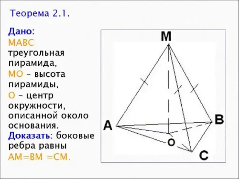 | Доказать: боковые рёбра равны АМ=ВМ =СМ | Доказать: углы между боковыми рёбрами и плоскостью основания равны | Доказать: углы между боковыми ребрами и высотой пирамиды равны |