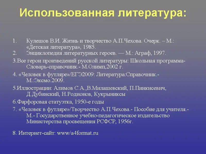 Учитель: Там, где властвует страх, господствует ничтожество, там нет места свободной жизни, и Чехов хотел показать эту диалектику (гипноз) страха. В образе Беликова Чехов раскрывает существенные черты обывателя-интеллигента, безыдейного, отошедшего от жизни, запуганного, дрожащего. Общие черты человека в футляре даны в образе Беликова, но человек в футляре распространенное явление времени- вот что хочет сказать Чехов. Имя чеховского героя стало нарицательным. За фигурой Беликова мы видим - беликовщину. А как думаете вы? (учащиеся высказываются)