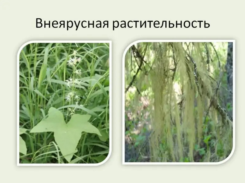 В лесу встречаются также и такие растения, которые не входят ни в один ярус, например лианы, покрывающие древесные стволы, а также мхи и лишайники, растущие на стволах и ветвях деревьев. Это так называемая внеярусная растительность.