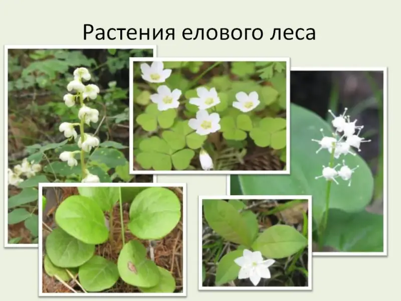 Все растения, произрастающие под пологом еловых лесов мелкие и невзрачные. И даже их цветы совсем мелкие и имеют белую окраску - это майник, грушанка, седмичник, кислица, такие цветки лучше всего заметны в густом сумраке, их легче находят насекомые - опылители.