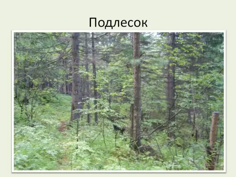 Кустарниковый ярус, произрастающий под пологом леса - называют подлеском. В состав подлеска входят только теневыносливые растения - способные мириться с недостатком света. Если и попадаются светолюбивые виды, то они выглядят угнетенными, не цветут и не плодоносят.