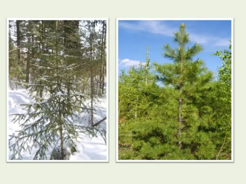 (На слайде фото: 1. Молодая ель, 2. Молодая сосна кедровая)