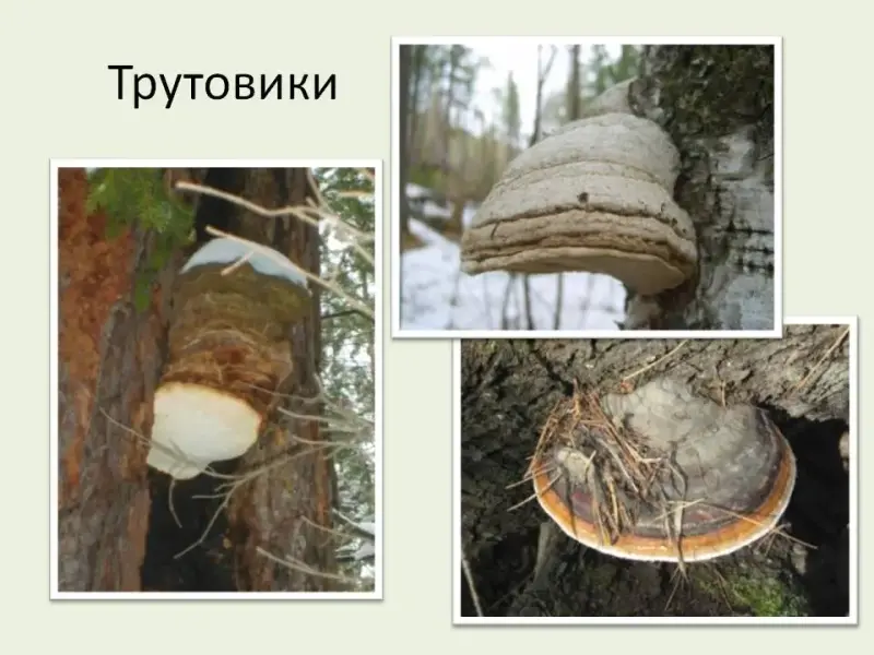 Некоторые виды грибов поселяются на стволах деревьев - это трутовики. Здесь на слайде представлены некоторые из них - это лиственничная губка, настоящий трутовик, окаймленный трутовик).