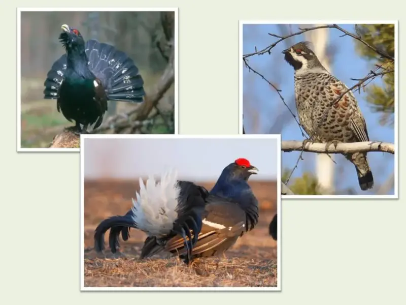 В лесу обитает множество птиц - как очень крупных, такие как глухари, рябчики, тетерева, особенно много мелких видов - синицы, поползни, пищухи, свиристели, снегири клесты и многие другие.