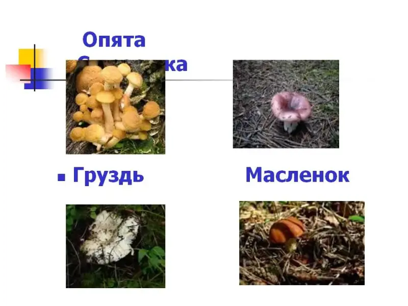 Педагог: В нашем лесу можно встретить и другие съедобные грибы. Посмотрите на экран. Это опята, сыроежки, маслята и грузди.