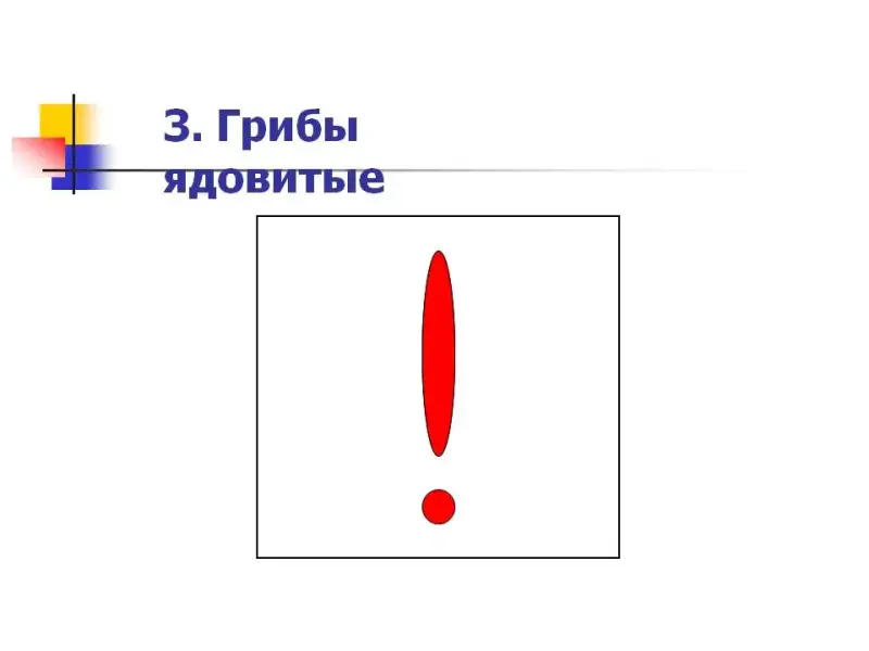 На экране появляется восклицательный знак, обозначающий слово «Ядовитые». Дети рисуют данный знак пиктограммы на листе «Рабочей тетради» в прямоугольнике после названия данной группы.