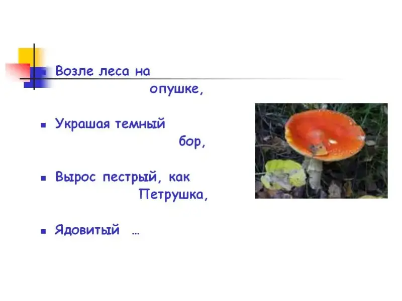 Педагог: Ядовитых грибов много в лесу, но они могут быть ядовиты только для человека, а для животных - полезны. (Слайд 20) Заболел, например,
