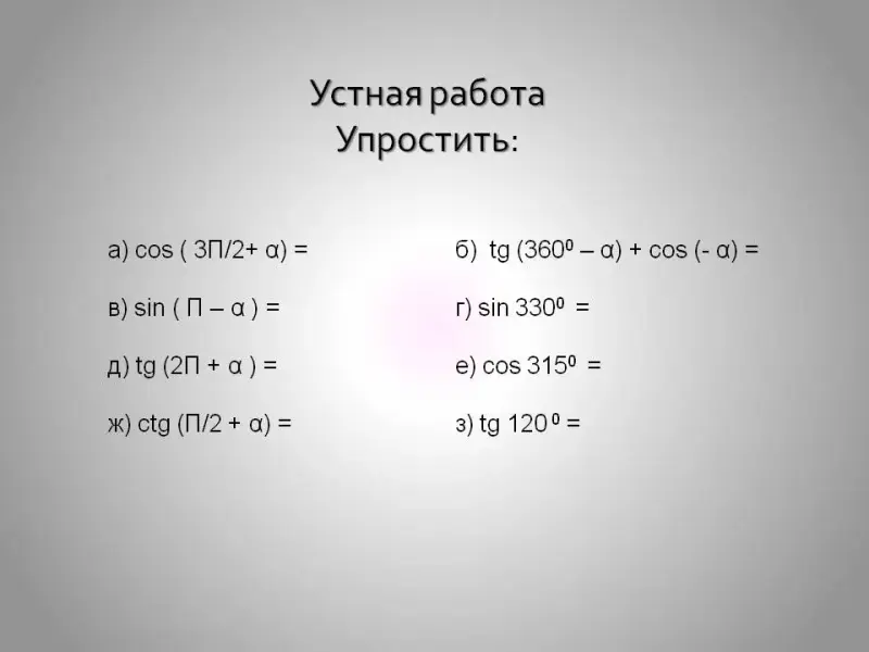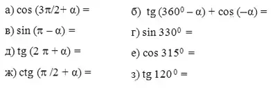 sin100o; cos70o; tg165o; cos(-215o); sin(-70o); tg (-130o)