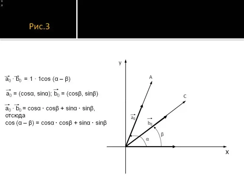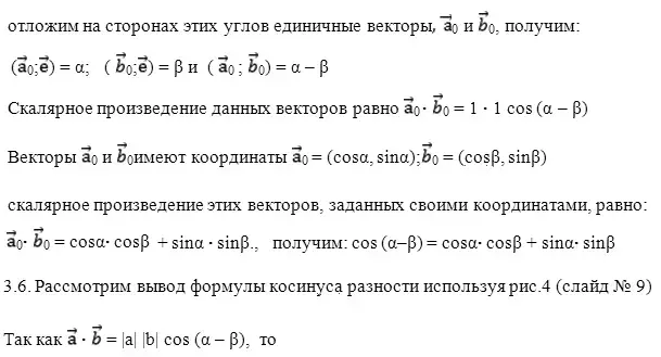 3.5. Используя скалярное произведение векторов, введем формулу косинуса разности аргументов (рис. 3 слайд №8)