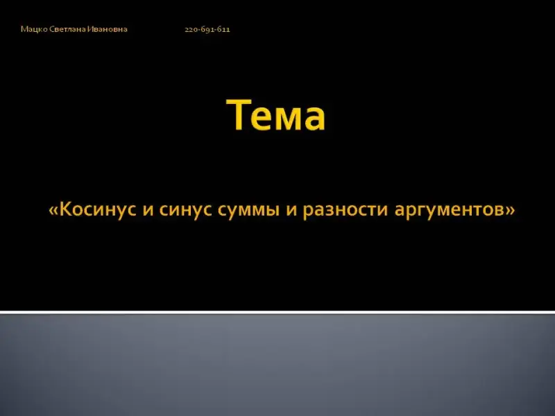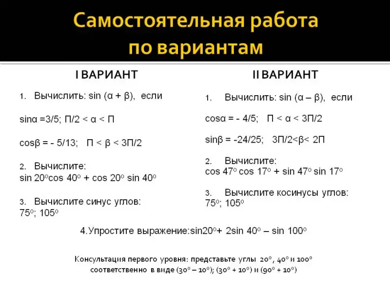 - Разработать и закрепить вывод формул для косинуса и синуса суммы и разности аргументов;