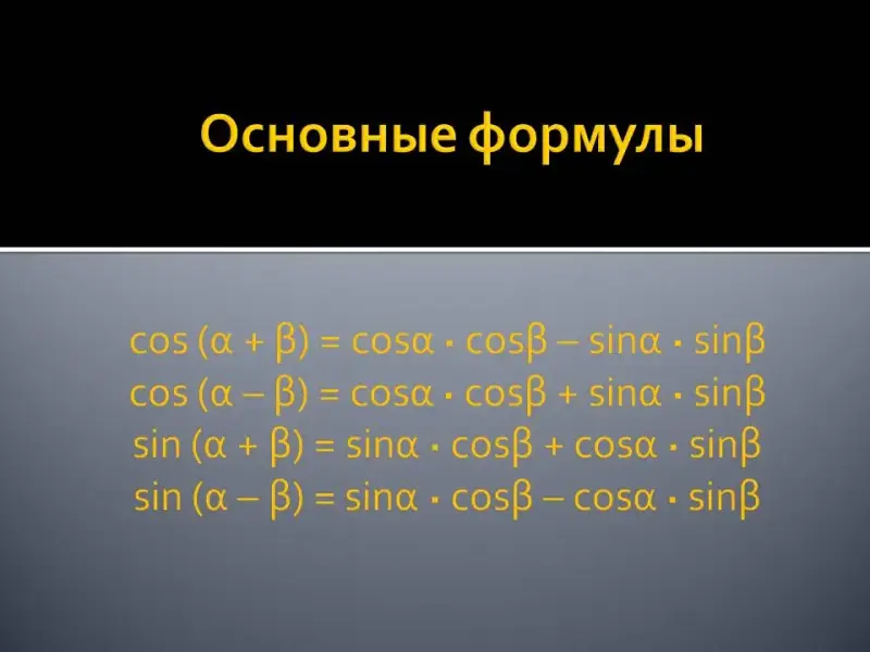 cos (α + β)= sin (90o - (α + β)) = sin ((90o - α) - β) = sin (90o - α) sinβ - cos (90o - α) sinβ = cosα · cosβ - sinα · sinβ