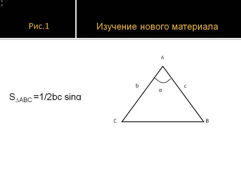 3.1. Рассмотрим ∆АВС (рис 1. Cлайд 6), ∟А = α;|AC| = b; |AB | = c, тогда S∆ABC = 1/2bc sinα