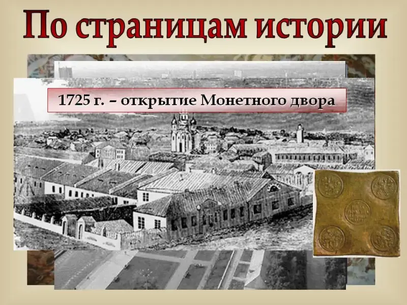 - 1725 год. Специальным указом был открыт на екатеринбургском заводе монетный двор. Для самофинансирования завода было велено делать платы - медные четырехугольные деньги.