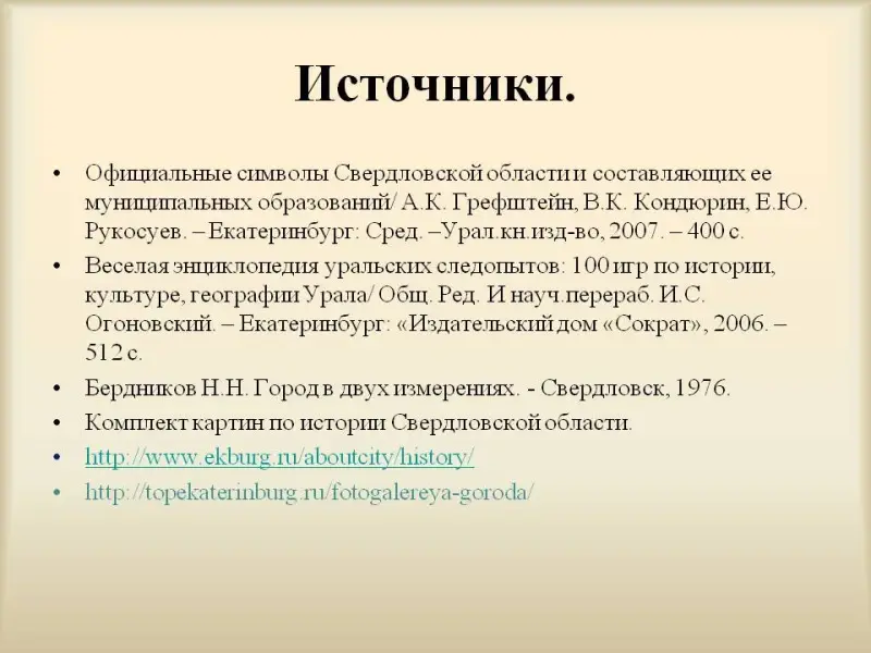 - Официальные символы Свердловской области и составляющих ее муниципальных образований/ А.К. Грефштейн, В.К. Кондюрин, Е.Ю. Рукосуев. - Екатеринбург: Сред. - Урал.кн.изд-во, 2007. - 400 с.