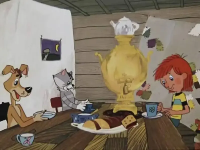 - Жили в деревне Простоквашино трое верных друзей: мальчик по имени дядя Федор, кот Матроскин и пес Шарик. Как-то вечером они все вместе чай пили.