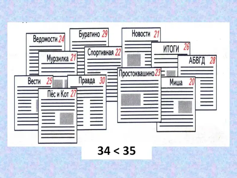 3. Шарик разнес 34 газеты, а Матроскин - 35. Шарик утверждает, что разнес больше. Прав ли он? (Нет, так как 34 < 35.)