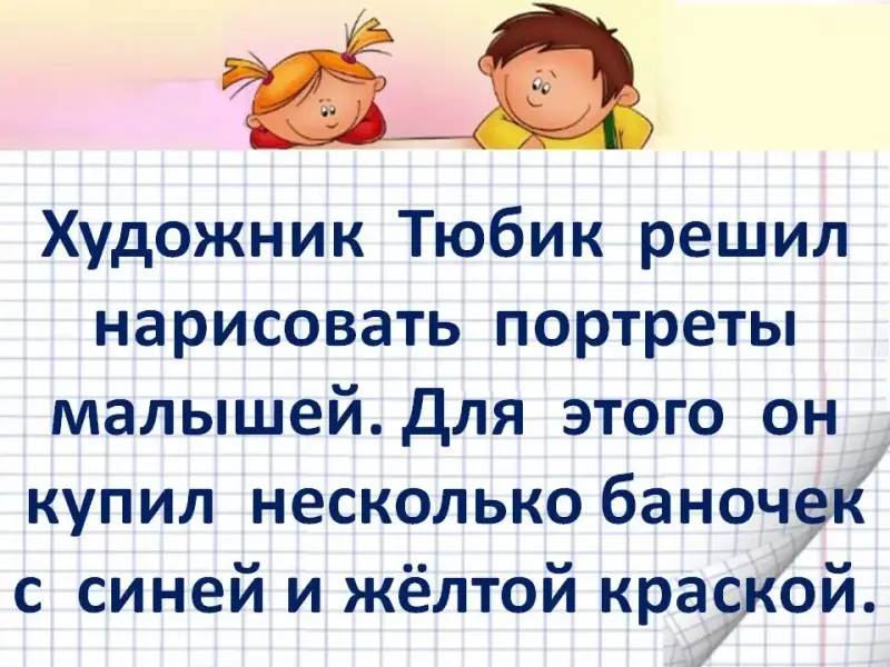 ХУДОЖНИК ТЮБИК РЕШИЛ НАРИСОВАТЬ ПОРТРЕТЫ МАЛЫШЕЙ. ДЛЯ ЭТОГО ОН КУПИЛ НЕСКОЛЬКО ТЮБИКОВ С СИНЕЙ КРАСКОЙ И ЖЁЛТОЙ.