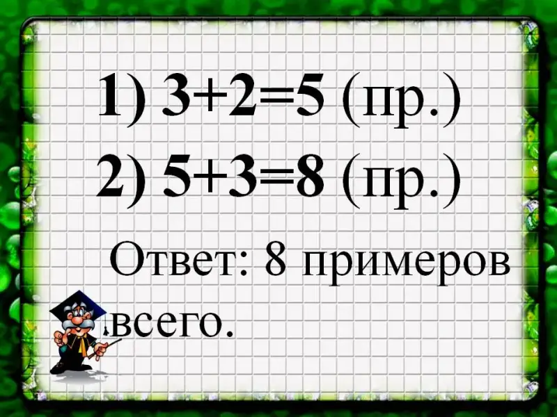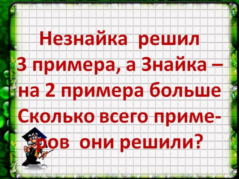 Незнайка решил 3 примера, а Знайка - на 2 примера больше. Сколько всего примеров они решили?