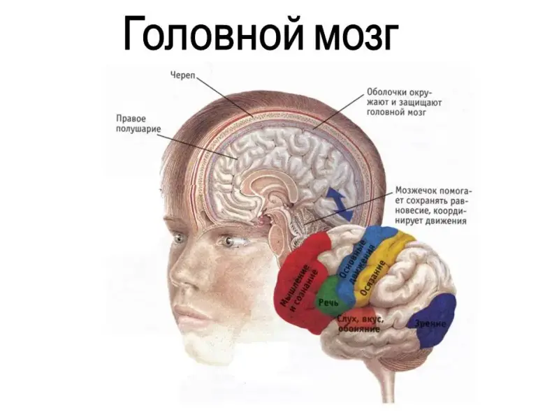 В здоровом организме все органы действуют слаженно. Согласует эту работу головной мозг. Он находится внутри черепа, который защищает его от внешних воздействий. В него стекается вся информация от всех органов чувств. Мозг узнает, что мы видим, слышим, чувствуем. Мозг принимает информацию, обрабатывает ее, и принимает решение. Все это происходит за доли секунды. Образно мозг разделен на разные участки, каждый из которых отвечает за свою область деятельности (лобовая часть - мыслительная деятельность, височные - слуховая, затылочная - зрение, теменная - движение и ощущения). Мозг - командный пункт, который управляет всем организмом. Повреждение одного из участков головного мозга ведет к сбою работы всего организма. (Слайд 10)