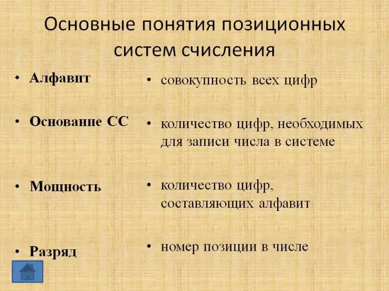 В позиционной системе счисления основными понятиями являются понятие алфавита и основания системы счисления.