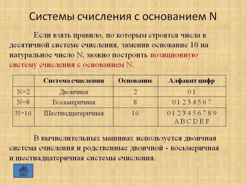 Если взять правило, по которым строятся числа в десятичной системе счисления, заменив основание 10 на натуральное число N, можно построить позиционную систему счисления с основанием N.