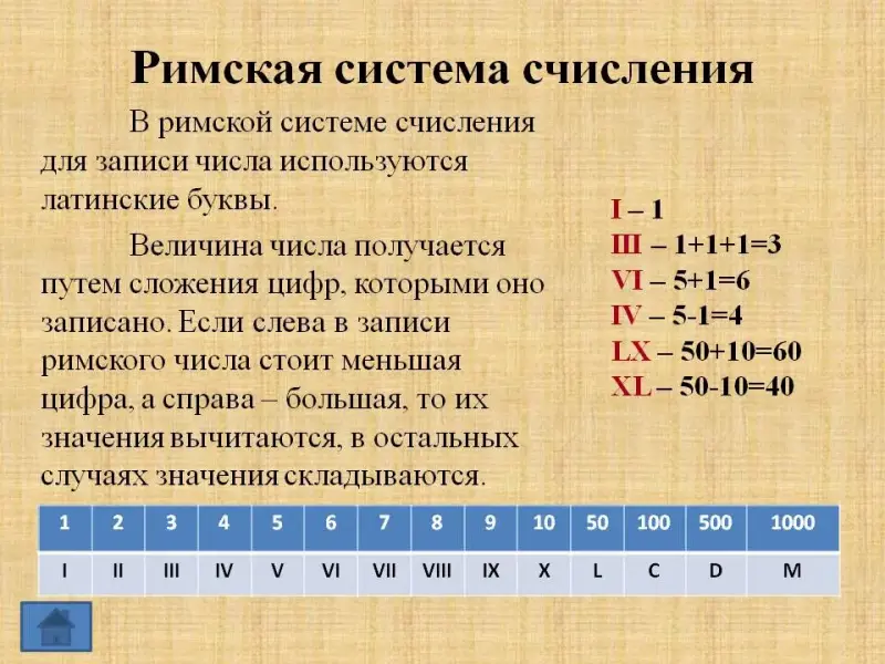 Римская система счисления является непозиционной системой. В ней для записи чисел используются буквы латинского алфавита. При записи чисел в римской системе счисления значением числа является алгебраическая сумма цифр, в него входящих. При этом цифры в записи числа следуют, как правило, в порядке убывания их значений, и не разрешается записывать рядом более трех одинаковых цифр. В том случае, когда за цифрой с большим значением следует цифра с меньшим, ее вклад в значение числа в целом является отрицательным. Типичные примеры, иллюстрирующие общие правила записи чисел в римской система счисления, приведены в таблице.