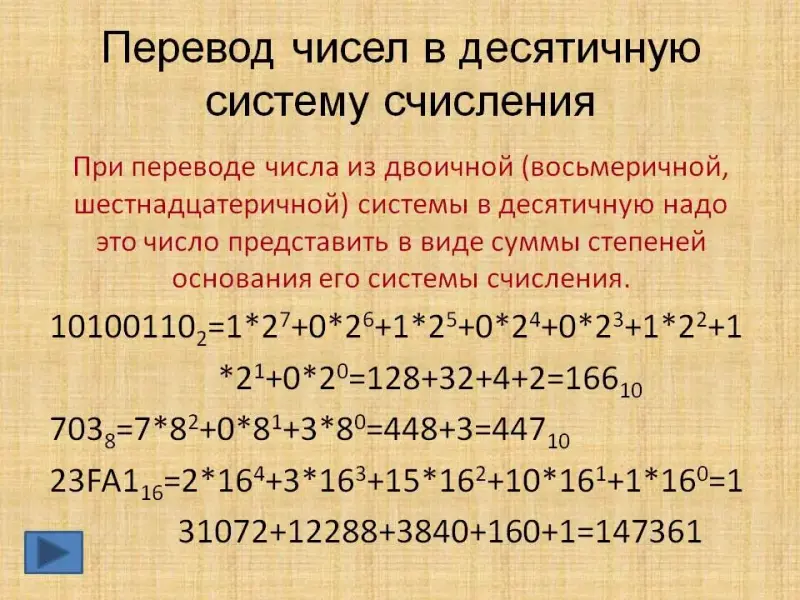 1. При переводе числа из двоичной (восьмеричной, шестнадцатеричной) системы в десятичную надо это число представить в виде суммы степеней основания его системы счисления.