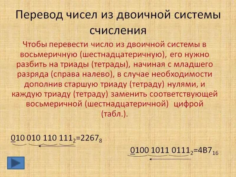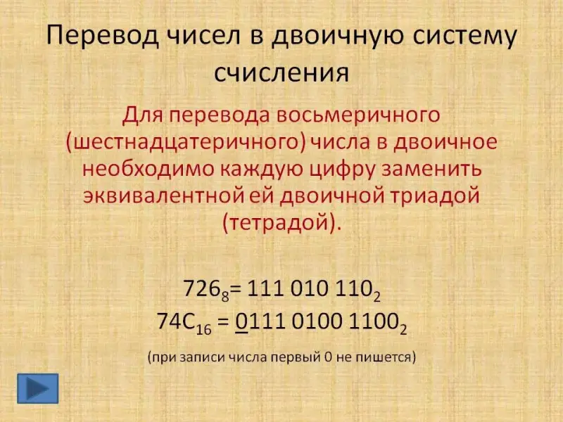 4. Для перевода восьмеричного (шестнадцатеричного) числа в двоичное необходимо каждую цифру заменить эквивалентной ей двоичной триадой (тетрадой).