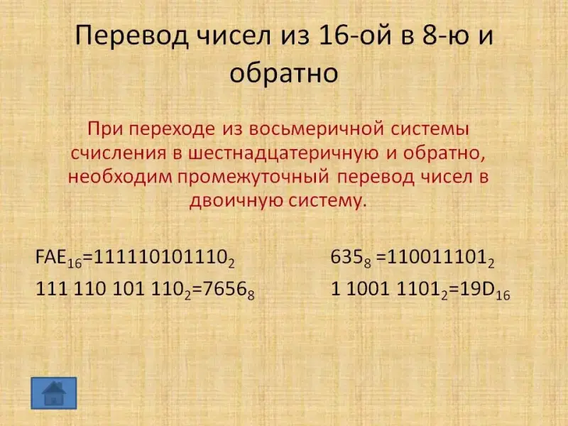 5. При переходе из восьмеричной системы счисления в шестнадцатеричную и обратно, необходим промежуточный перевод чисел в двоичную систему.