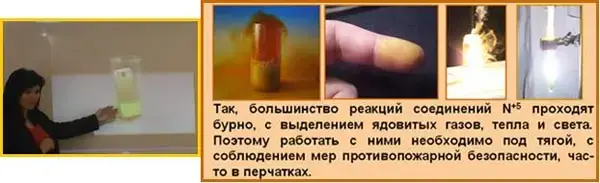 - Большинство реакций проходят бурно с выделением ядовитых газов, тепла и света.