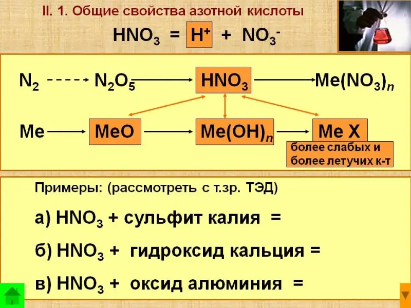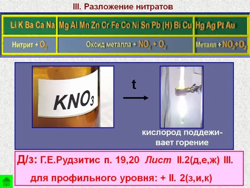 Ццель: конкретизировать общие знания о свойствах азотной кислоты и её солей в набор возможных реакций с простыми и сложными веществами, обсудить реакции разложения.