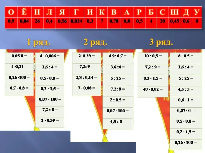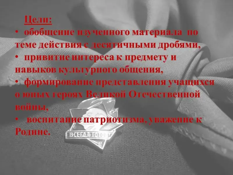 Цель: привитие интереса к предмету, обобщение изученного материала по теме действия с десятичными дробями, привитие навыков культурного общения. Сформировать представления учащихся о Великой Отечественной войне и ее героях, воспитывать патриотизм, уважение к Родине.