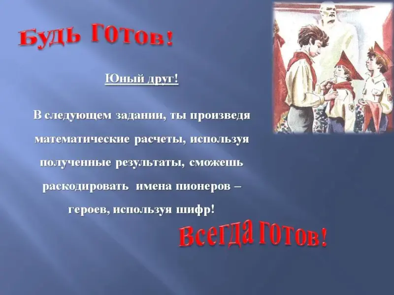 Произведя математические расчеты и используя полученные результаты, ты сможешь раскодировать имена пионеров - героев, используя ключ к шифру! (работаем по карточкам)