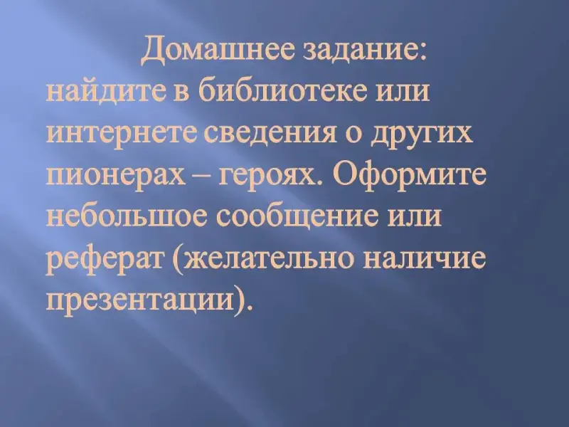 Д/з: найти в библиотеке или Интернете сведения о других пионерах-героях.