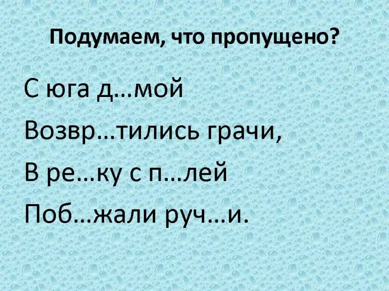 Возвратились грачи, В речку с полей Побежали ручьи. |