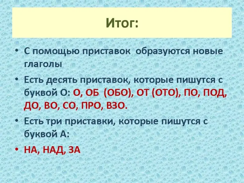 2. Есть десять приставок, которые пишутся с буквой О: О, ОБ (ОБО), ОТ (ОТО), ПО, ПОД, ДО, ВО, СО, ПРО, ВЗО. 3. Есть три приставки, которые пишутся с буквой А: НА, НАД, ЗА |